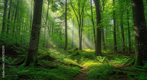 © JerseyKita, Naklejka premium Sunlit Forest Path with Lush Green Undergrowth and Delicate Spid