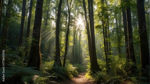 © sitifatimah, Obraz premium Sunlit forest path with lush greenery