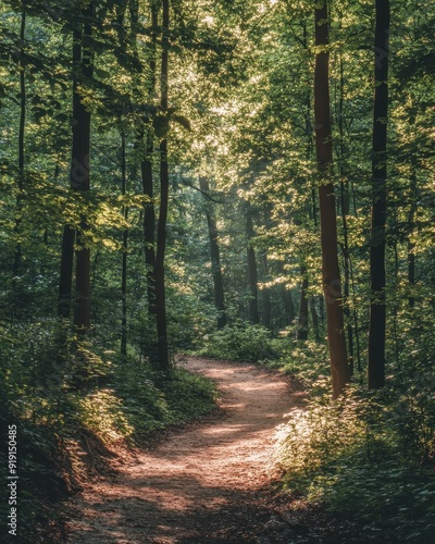 Fototapeta premium Sunlit Forest Path with Lush Greenery and Sunlight Streaming Through Trees