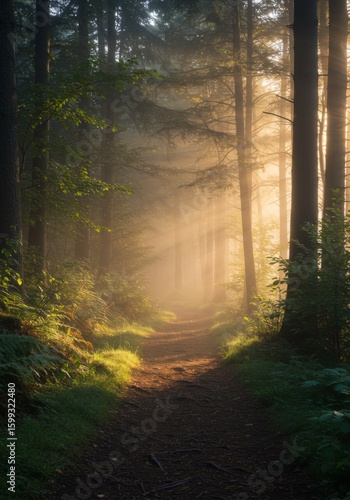 Fototapeta premium Sunlit Forest Path With Misty Fog