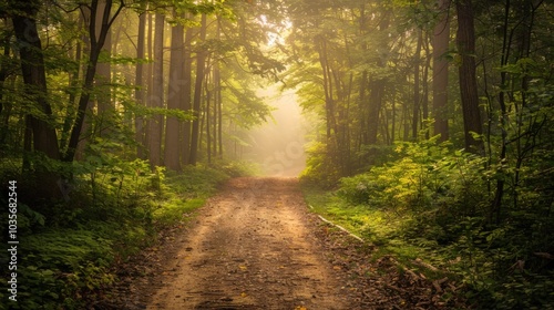 © Mahavira Osa, Fototapeta premium Sunlit Forest Path with Morning Mist