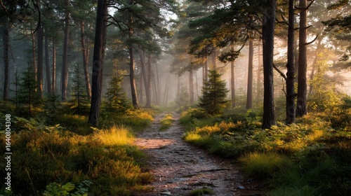 Obraz premium Sunlit Forest Path with Morning Mist