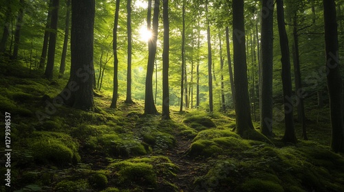 © Arc std., Obraz premium Sunlit forest path with moss.
