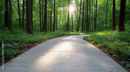 © siraphol, Fototapeta premium Sunlit forest path with soft shadows and peaceful morning light