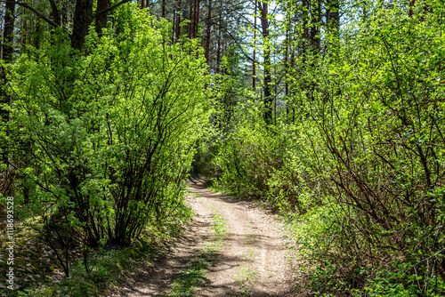 © Birute Vijeikiene, Fototapeta premium Sunlit forest path with spring greenery