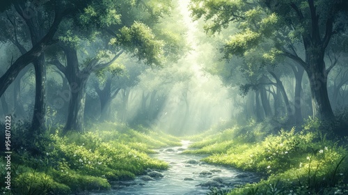 Fototapeta premium Sunlit Forest Path with Stream - Peaceful Nature Scene.