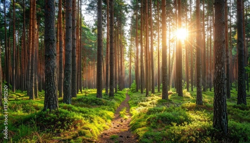 © Bas, Fototapeta premium Sunlit Forest Path With Tall Trees And Green Undergrowth In Natural Daylight