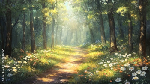 © Sleeping Carbuncle, Obraz premium Sunlit Forest Path with Wildflowers