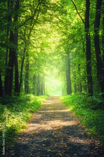 Fototapeta premium Sunlit Forest Pathway Inviting a Peaceful Walk