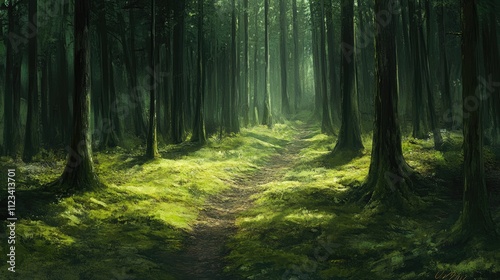 © Boonnam Burart, Fototapeta premium Sunlit Forest Pathway Surrounded by Lush Green Trees and Moss