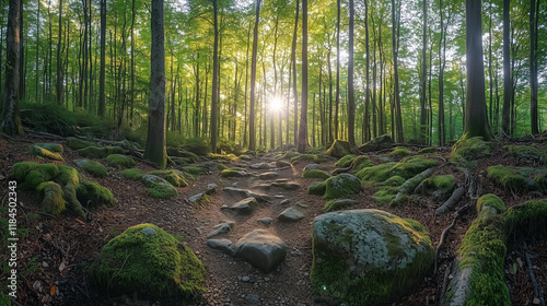 Fototapeta premium Sunlit Forest Pathway Surrounded by Lush Greenery and Stones