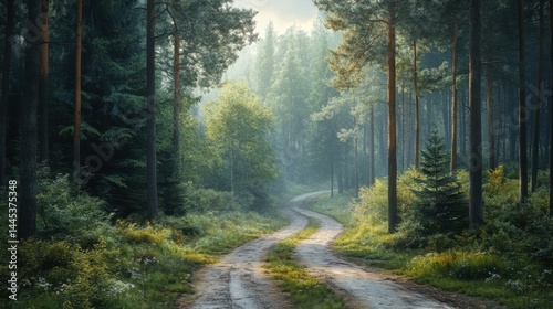 Fototapeta premium Sunlit forest pathway with lush greenery and tall pine trees in a serene...