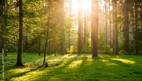 Fototapeta premium sunlit forest scene green grass and trees create shadows and light in outdoor...
