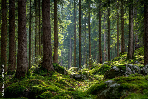 © Tohamina, Obraz premium Sunlit forest scene mossy rocks tall trees green foliage nature landscape