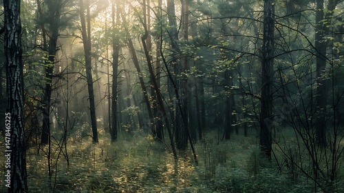 Fototapeta premium Sunlit Forest Scene Showing Trees Sunlight And Green Foliage In A Peaceful...