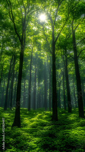 Obraz premium Sunlit forest scene with tall trees and lush green undergrowth.
