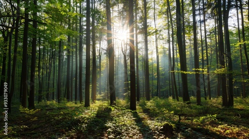 Naklejka premium Sunlit Forest Serenity, a tranquil woodland scene where golden rays filter...