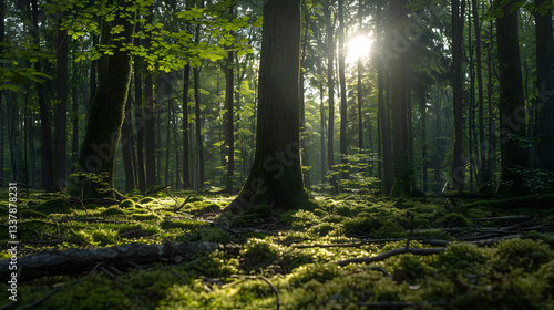 © Dreamnitive, Fototapeta premium Sunlit Forest Serenity - Tranquil Green Woodland Scene