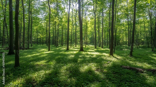 Fototapeta premium Sunlit forest showcasing vibrant green foliage and serene atmosphere.