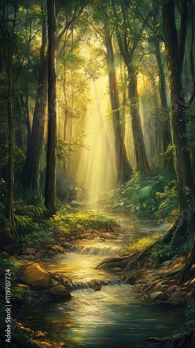 © LyceeChee, Fototapeta premium Sunlit Forest Stream A Peaceful Woodland Scene