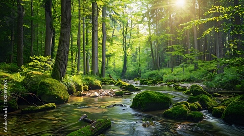 © Ardhana, Fototapeta premium Sunlit Forest Stream Flows Over Mossy Rocks