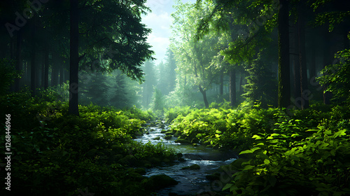 © Arthur Constantine, Fototapeta premium Sunlit Forest Stream, Lush Green Trees and Foliage