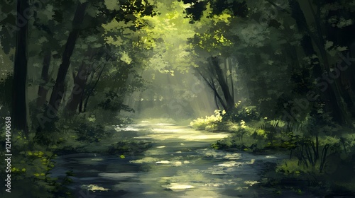 © fledermausstudio, Fototapeta premium Sunlit Forest Stream Lush Greenery Tranquil Nature Scene