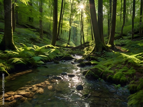 © Sokimimi Studio, Fototapeta premium Sunlit Forest Stream Mossy Rocks Green Nature
