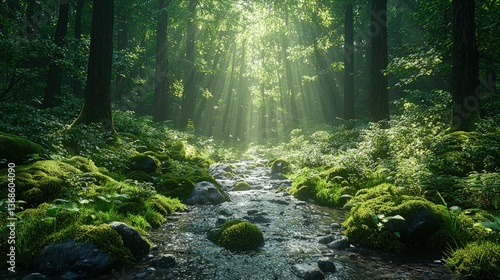 © Ali, Obraz premium Sunlit forest stream, mossy rocks, tranquil scene