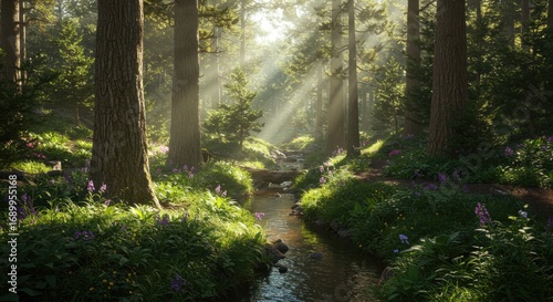 Obraz premium Sunlit Forest Stream with Wildflowers and Majestic Trees