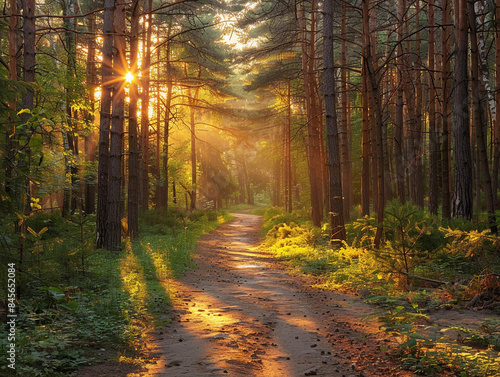 © pavlofox, Obraz premium Sunlit Forest Trail at Dawn