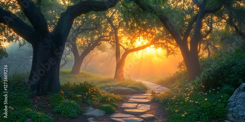 Naklejka premium Sunlit Forest Trail Leading to a New Dawn