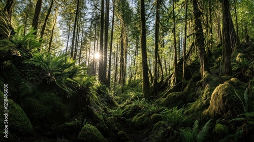 © NAIMAH, Fototapeta premium Sunlit Forest Trail, Mossy Rocks, Pacific Northwest, Nature Background, Eco Tourism