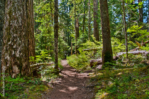 Fototapeta premium Sunlit forest trail to Packwood Lake in Washington.
