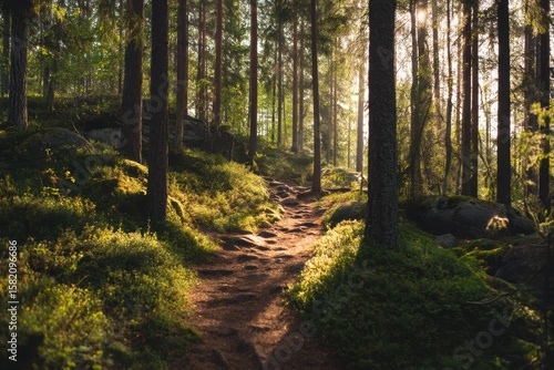 Naklejka premium Sunlit forest trail winding through mossy ground with tall trees casting...