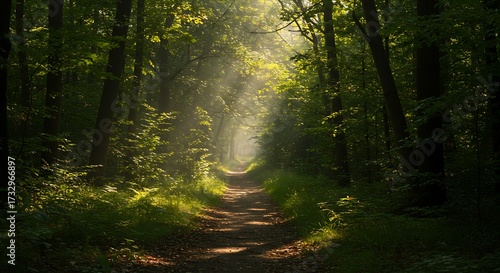 © Hooh, Fototapeta premium Sunlit forest trail with tall trees and atmospheric light creating a path