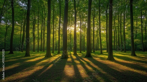 © Ali, Fototapeta premium Sunlit forest; trees cast long shadows.