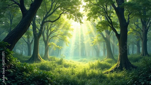 © Beniamin, Obraz premium Sunlit forest with lush greenery and majestic trees