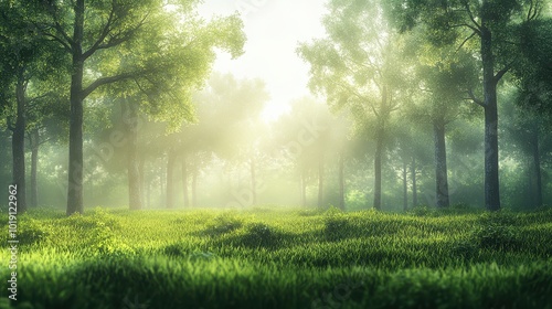 Obraz premium Sunlit Forest with Mist and Greenery