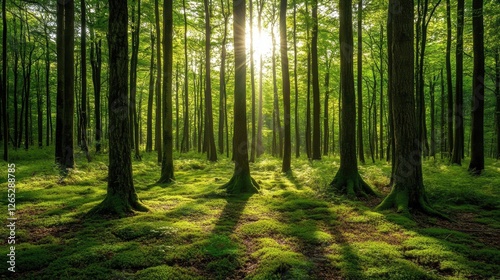 Obraz premium Sunlit forest with moss-covered ground, tall trees. Perfect for nature,...