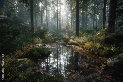 Obraz premium Sunlit forest with tranquil stream