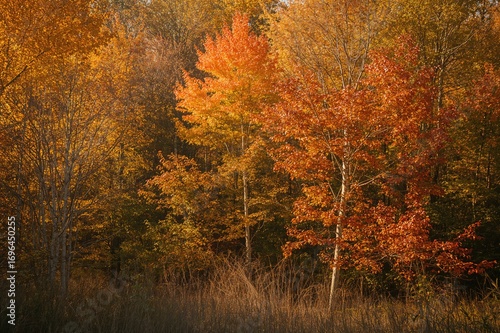 Fototapeta premium Sunlit forest with vibrant fall foliage