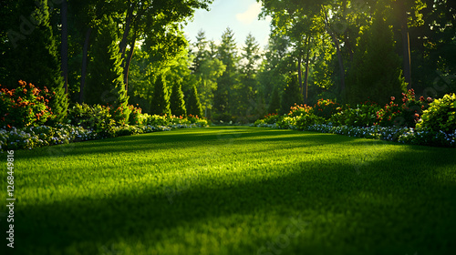 © Arthur Constantine, Obraz premium Sunlit Garden Path Through Lush Green Forest