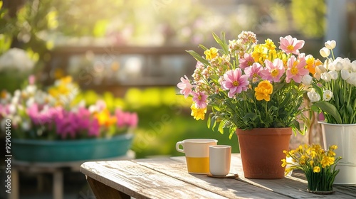 Fototapeta premium Sunlit Garden Table: A rustic wooden table in a vibrant garden setting, adorned with a terracotta pot of colorful flowers