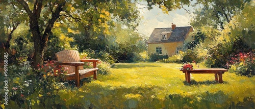 Obraz premium Sunlit Garden with Two Benches and a Small Cottage