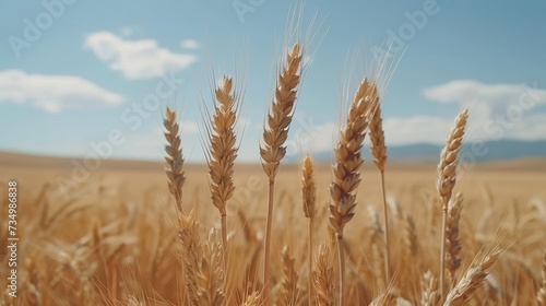 © Ilja, Fototapeta premium Sunlit golden wheat plantation abstract background in vibrant summer day landscape