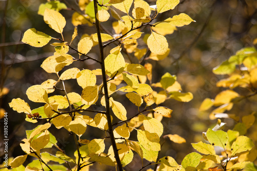 © Jackie, Fototapeta premium Sunlit golden yellow Autumn leaves, close-up view, natural background
