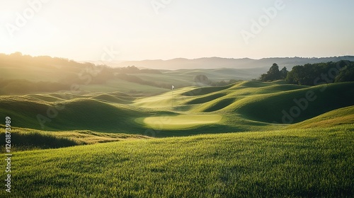 Obraz premium Sunlit Golf Course Rolling Hills Landscape
