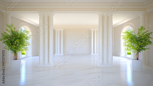 Fototapeta premium Sunlit, grand hall with marble floors, white columns, arched windows, and potted plants