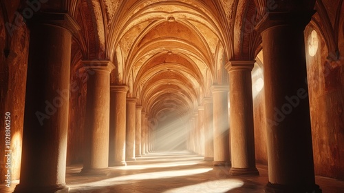 © Bendot, Fototapeta premium Sunlit Grandeur - A Majestic Hallway with Arched Ceilings and Columns.